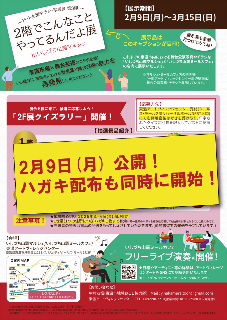 【応募方法】2月9日(月)~3月6日(金)東温アートヴィレッジセンター受付(クールス・モール2階リハーサルホールNEST入口)(営業時間:10:00〜20:00 ※火曜定休)にて応募用官製はがきを受け取り、印字されたクイズに回答を記入してポストに投函してください。