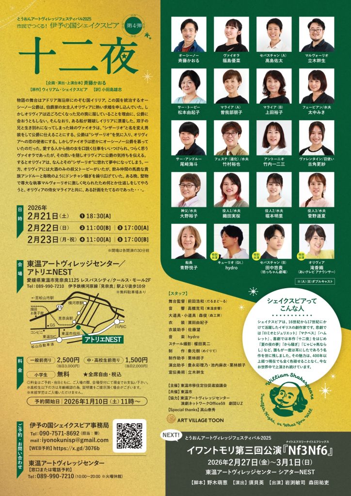 2026年2月21日(土)〜23日(月・祝)、東温アートヴィレッジセンター/アトリエNESTにて、伊予の国シェイクスピア『十二夜』が上演されます。