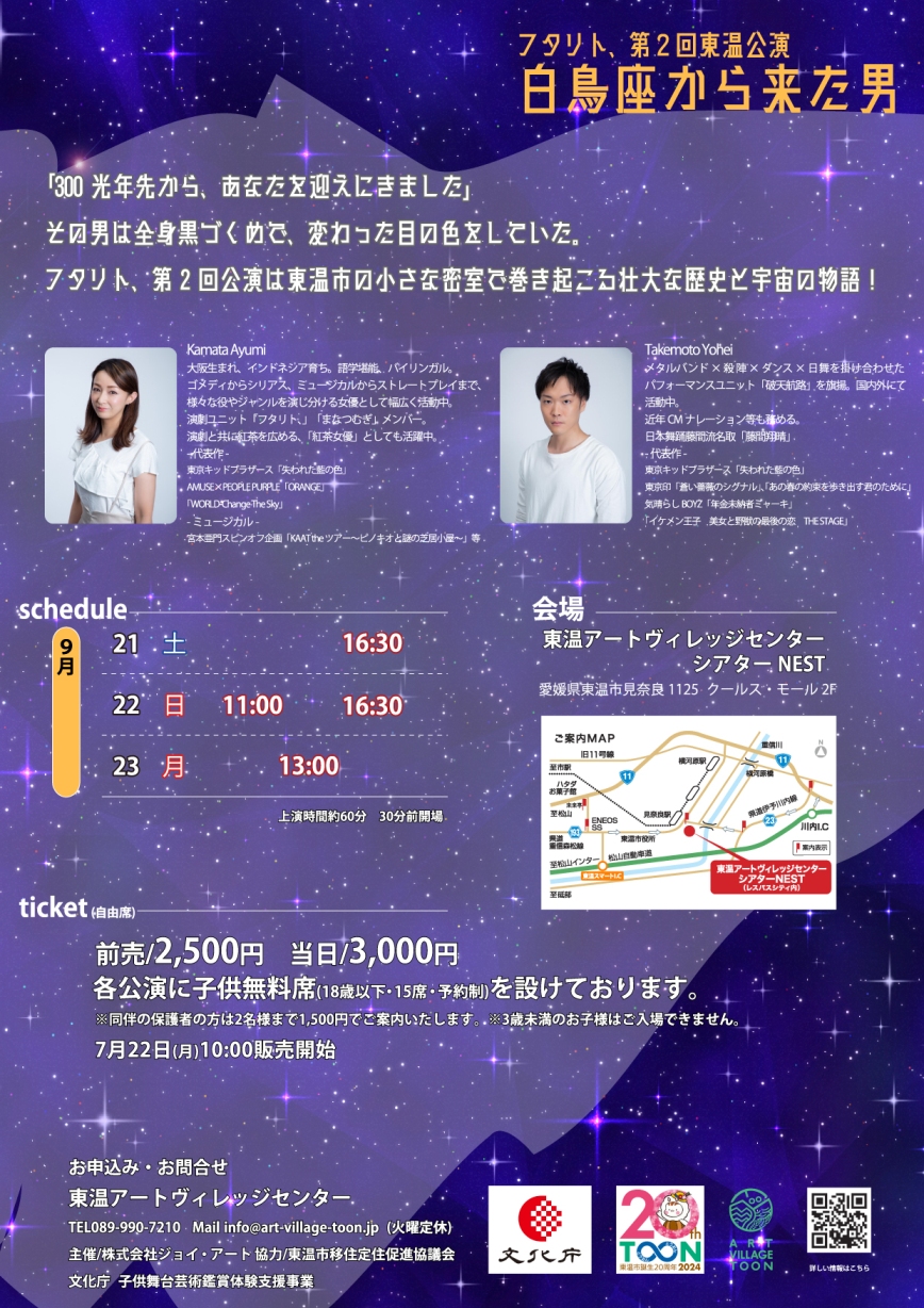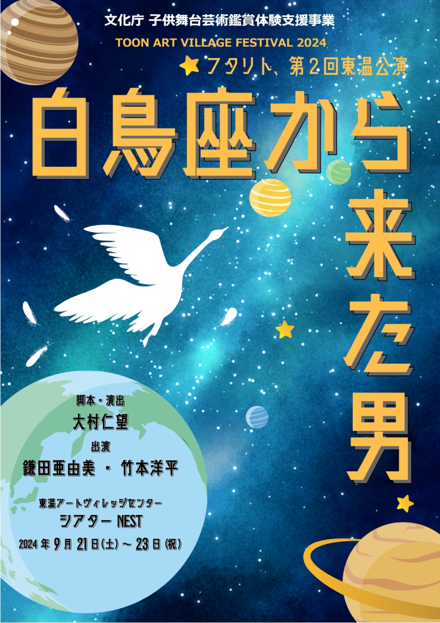 2024年9月21日〜23日、俳優・鎌田亜由美と竹本洋平による演劇ユニット・フタリト、の第2回東温公演『白鳥座から来た男』が上演されました。