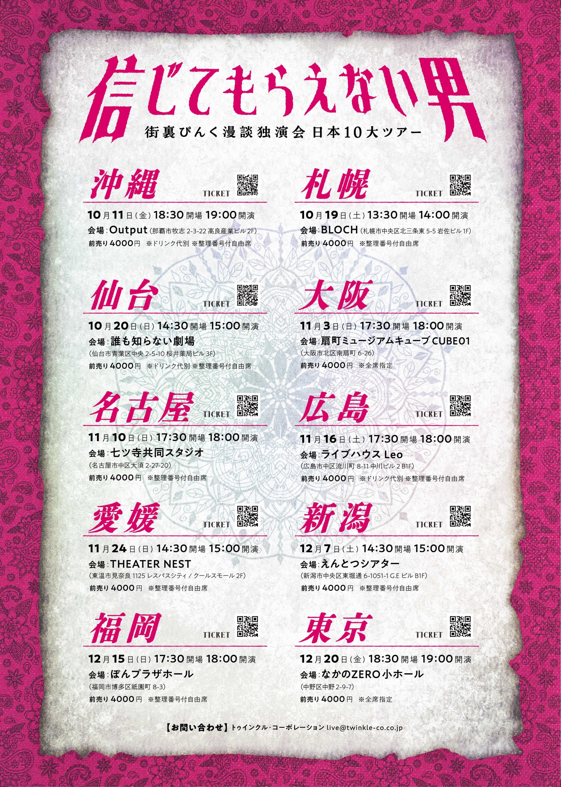 【街裏ぴんく】漫談独演会 日本10大ツアー『信じてもらえない男』開催決定!
