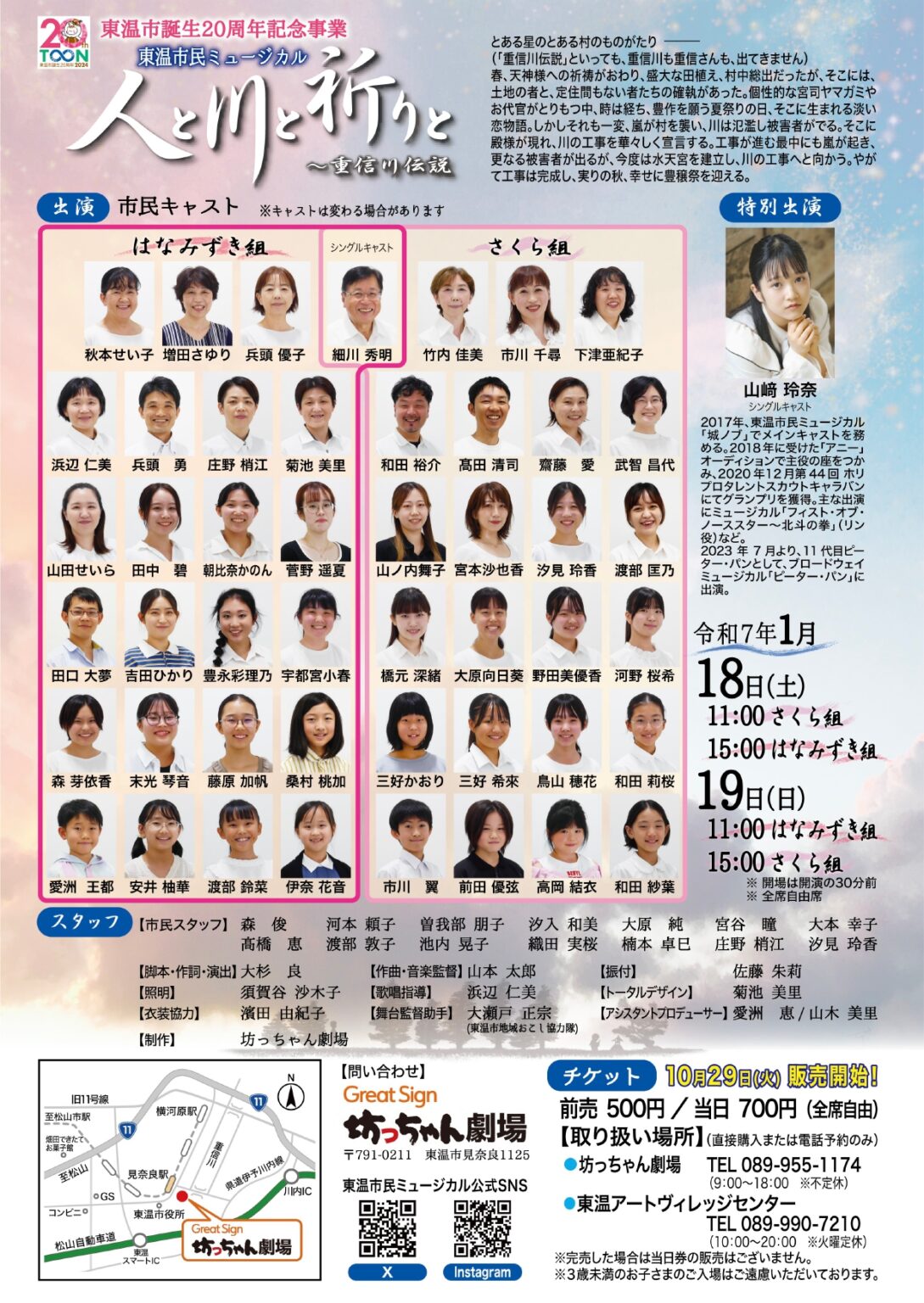 2025年1月18日(土)、19日(日)、坊っちゃん劇場にて東温市民ミュージカル『人と川と祈りと~重信川伝説』が上演されました。